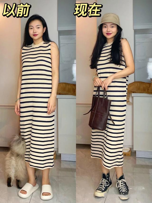 不得不說這位博主以前的穿搭,真的是非常的接地氣呀。砍袖元素的長款背心裙,配一雙厚底的拖鞋,家居風十足,哪有什麼時尚感可言。