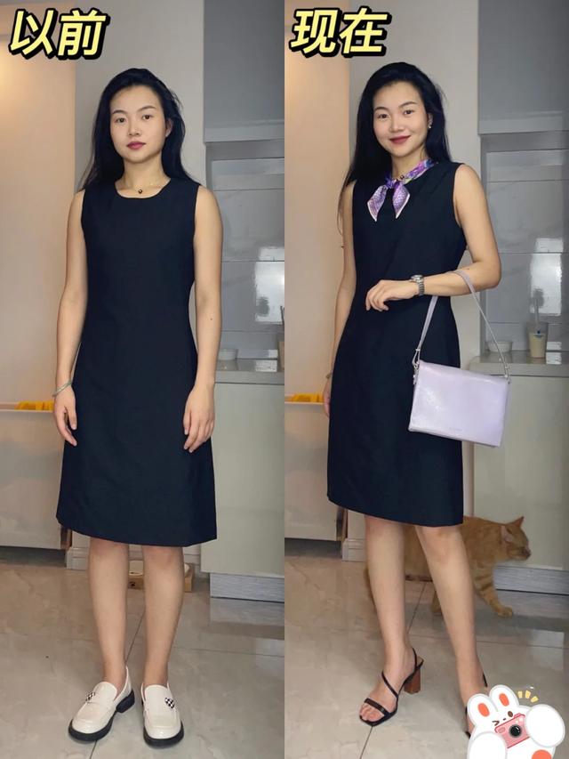 現在的穿搭更加時尚精緻一些,還是同樣的黑色連衣裙,但是搭配了棕色系的單鞋和精緻的小挎包,色彩上的撞擊雅致又時髦。尤其是挽起的長髮,更多了清爽感。