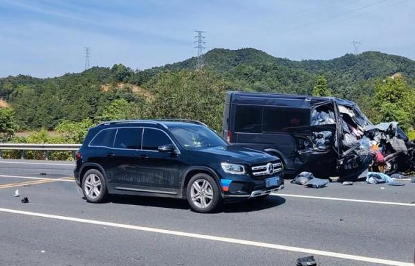 往前開了30米左右,李周龍看到了事故現場:一輛黑色麵包車撞上中央護欄後橫停在第一車道上,車身右側受損嚴重,中央護欄也已經被撞變形;車道上灑落著不少因撞擊掉落的拋灑物,前方不遠處的第二車道上還停著一輛大貨車。過往車輛紛紛避讓,十分危險。