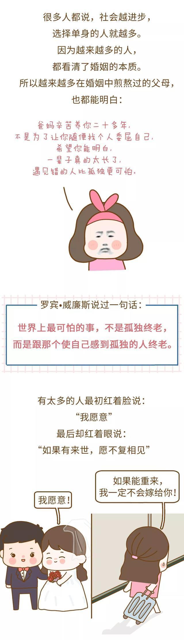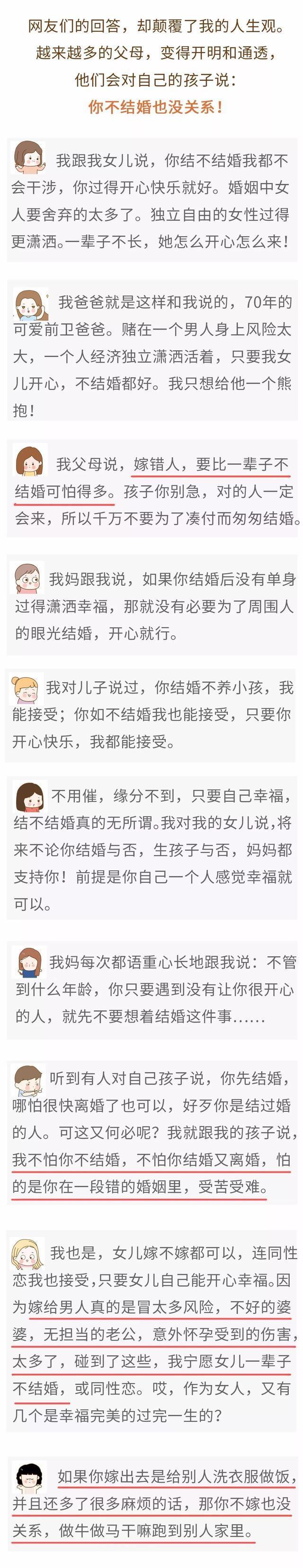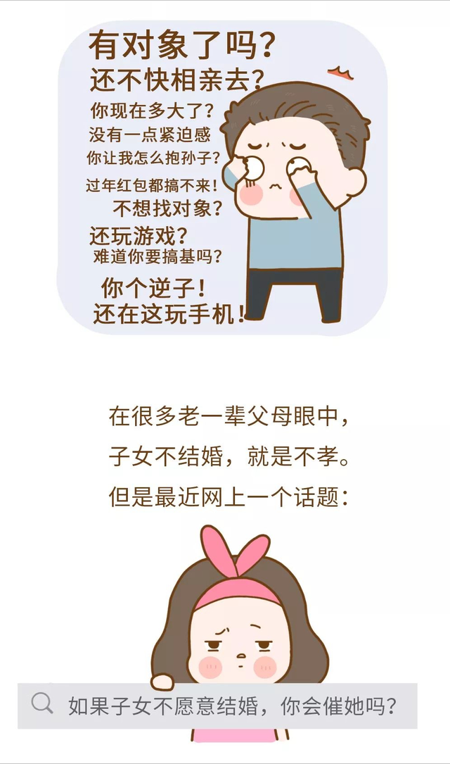 但是不少父母就認為結婚生子並不只是為了婚姻世俗,而只是為了父母離開之後可以有一個穩定的陪伴,其實無論是怎樣的想法,如果不能和合適的人、喜歡的人在一起,那麼婚後的生活並不一定都可以像父母想的那樣如意,甚至可能會造成一生的傷害。人生只有一次,大可不必因為一些世俗規則而將自己束縛,做自己,做那些你不會後悔的決定。