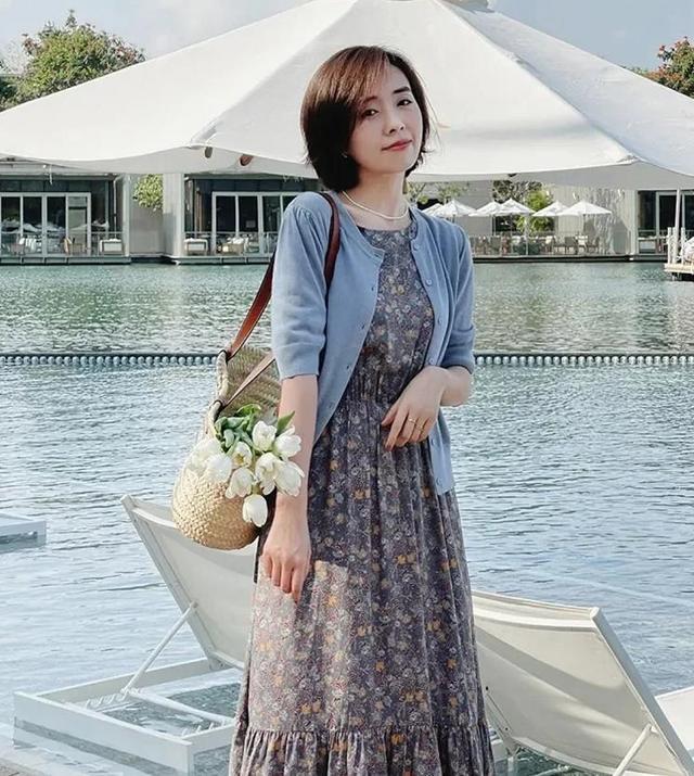 像這位博主身上這件淺藍色小開衫,顏色就很友好,完全不挑年齡和膚色的,小短款的設計,上身後更是輕鬆提高腰線。內搭碎花連衣裙,外簡+內繁的組合,頗顯層次感的,有木有?