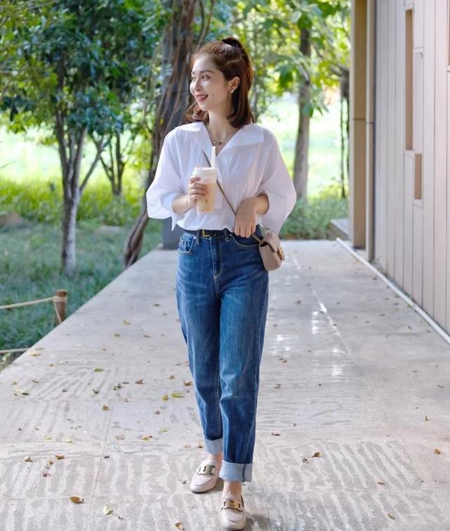 小個子的中年女生,入秋後該怎麼穿呢?試試這位博主示范的白色長袖襯衫+牛仔直筒褲吧,那麼乾淨的配色,真的太顯精神了,襯托得整個人都很年輕,對吧?
