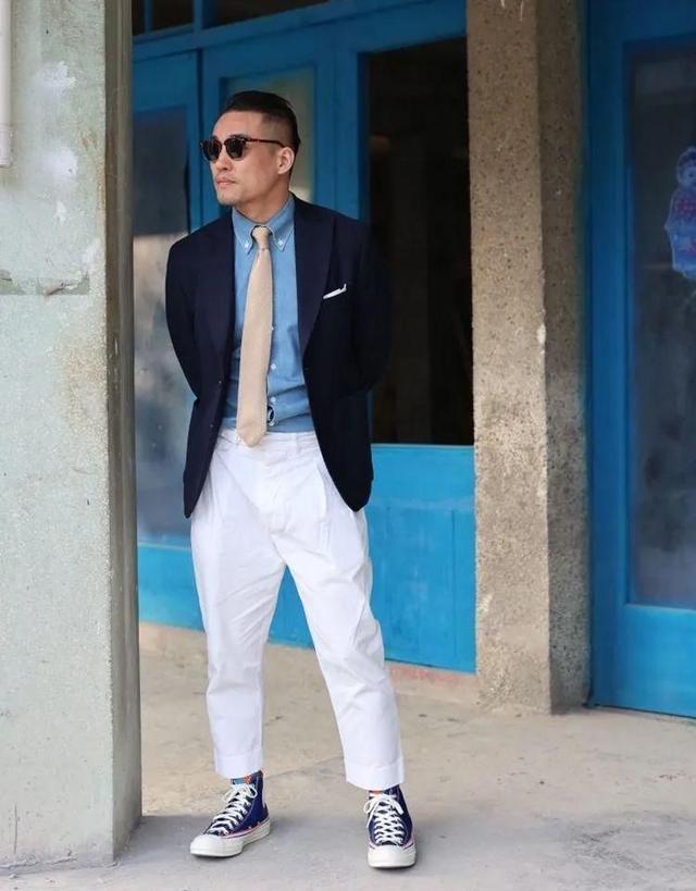 牛仔藍西服疊穿藍色襯衣,褪去了西服原本的嚴肅與沉悶感,襯托出更加休閒愜意的穿搭氣氛感。下半身搭配白色休閒褲和牛仔藍帆布鞋,半正式半休閒的混搭風造型,視覺年齡比實際年齡顯小好幾歲,還能起到提亮膚色的效果。