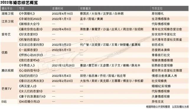 毫無疑問,戀綜已經成為音樂綜藝之後最受關註的綜藝類型,《綜藝報》梳理各平臺2022片單,婚戀綜藝多達18部。
