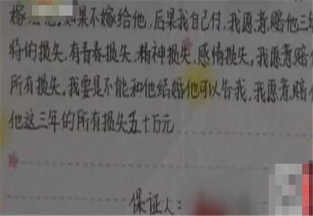 這時靜靜就說了,叔叔阿姨別擔心,我給您寫份保證書,保證我以後絕對會嫁給大山,我這輩子就想和他在一起,就是和他結婚。於是在上大學之前的暑假,靜靜拿出了這樣一份保證書。除了承諾自己一定會嫁給大山之外,還保證自己要是不能和他結婚,大山可以告她,她願意賠償他三年的所有損失五十萬元。最終大山的父母放下了顧慮,他們的生活又平穩地繼續下去了。