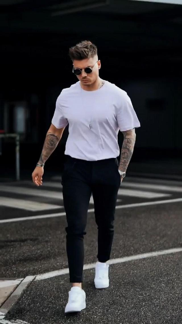 還有就是前塞,夏季身材較壯的男士,可以通過利用前塞T恤來凸顯身線,這樣的穿搭時尚又顯比例。整體配上一雙帆布鞋,可日常可商務。