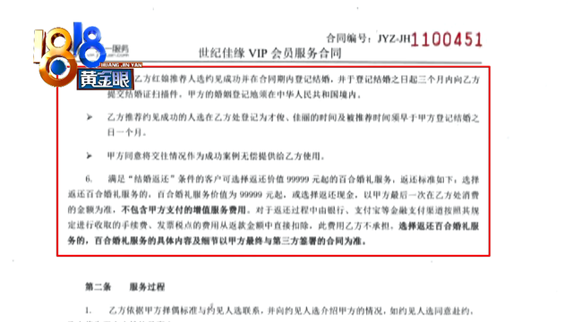 夏女士認為紅娘沒有按照自己的要求推薦男會員,她說當時自己簽的是婚保合同,一年服務期內如果跟男會員相親成功結婚,可以享受99999元錢起的百合婚禮服務。所以我覺得他們這個婚保合同,是存在一定的訛詐性的,沒有做到真正的為我去量身定制的去找一個男士,所有的男士感覺都是隨機的,覺得有點敷衍的形式。