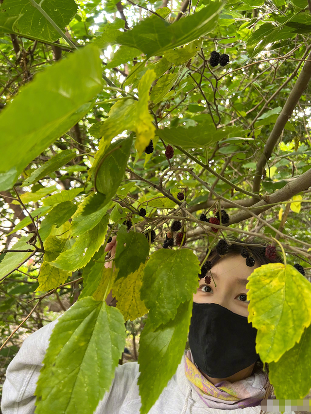 畫面中的她同樣包裹嚴實,和桑葚果樹合影。