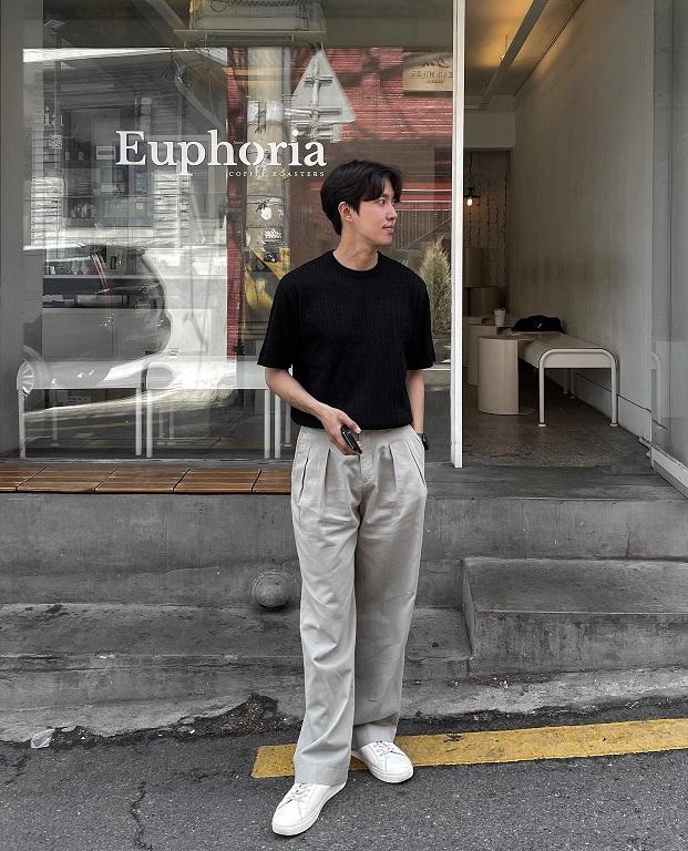 喜歡輕熟風些的話,一件高級感十足的黑色T恤,加上高腰闊腿褲,高腰設計能夠突出身材優勢,簡單利落又很乾淨的男生穿搭。▼