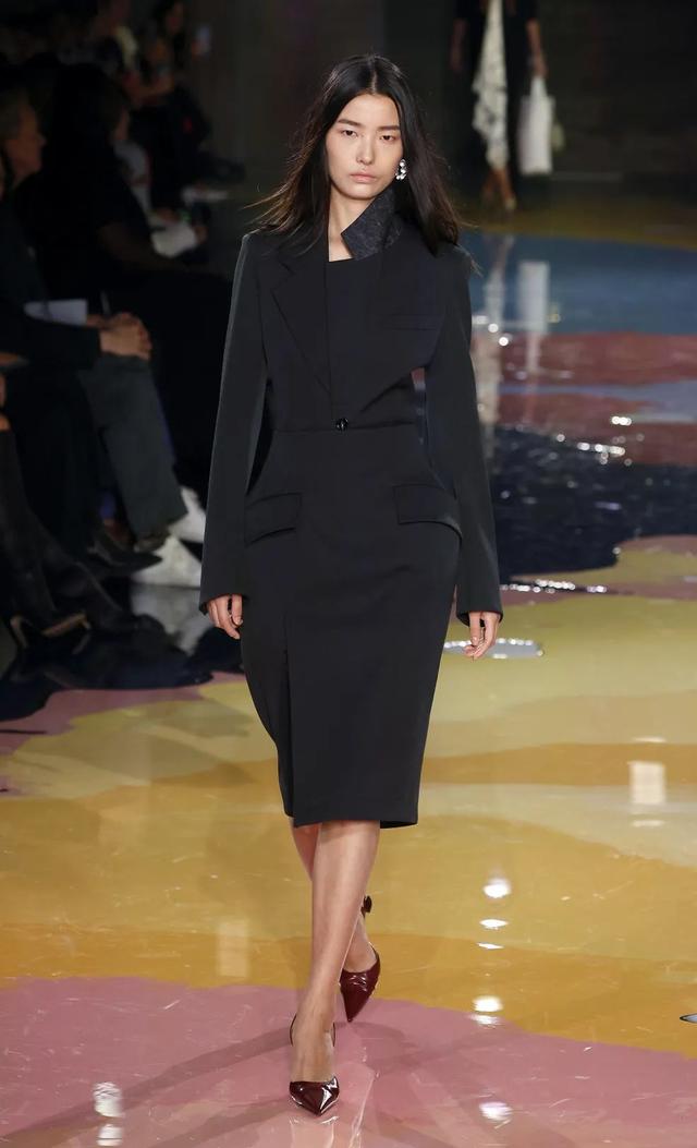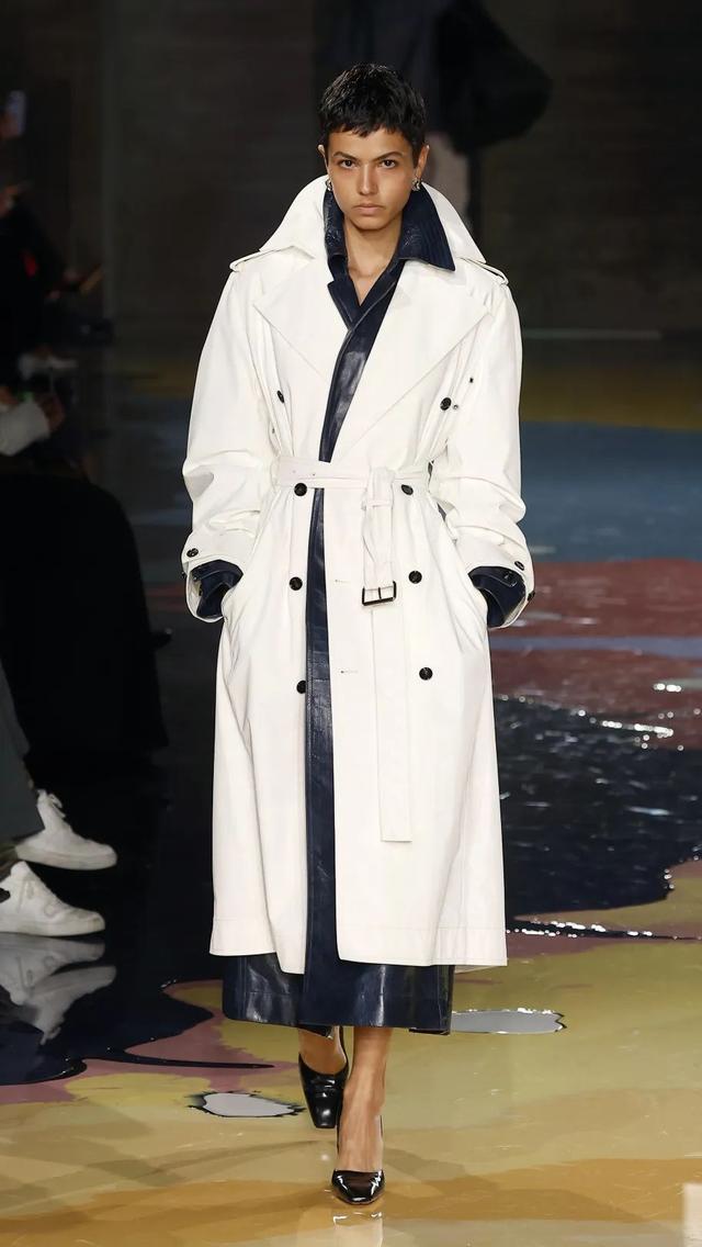 Matthieu Blazy創造的新概念「動態廓形」在本季延續,褲腿後側仿佛魚類鰭片的布料,在模特走動時帶來運動感讓廓形更加鮮活。同樣,大衣領部模擬被風吹過的自然狀態作為設計一直停留在那裡,讓人感受到「樹欲靜而風不止」的意境。而裙裝胸前的雙層垂墜設計用立體剪裁帶來動態效果,還原紗質才有的薄透感以及隨身度,連褶皺都是輪廓的精心編排。