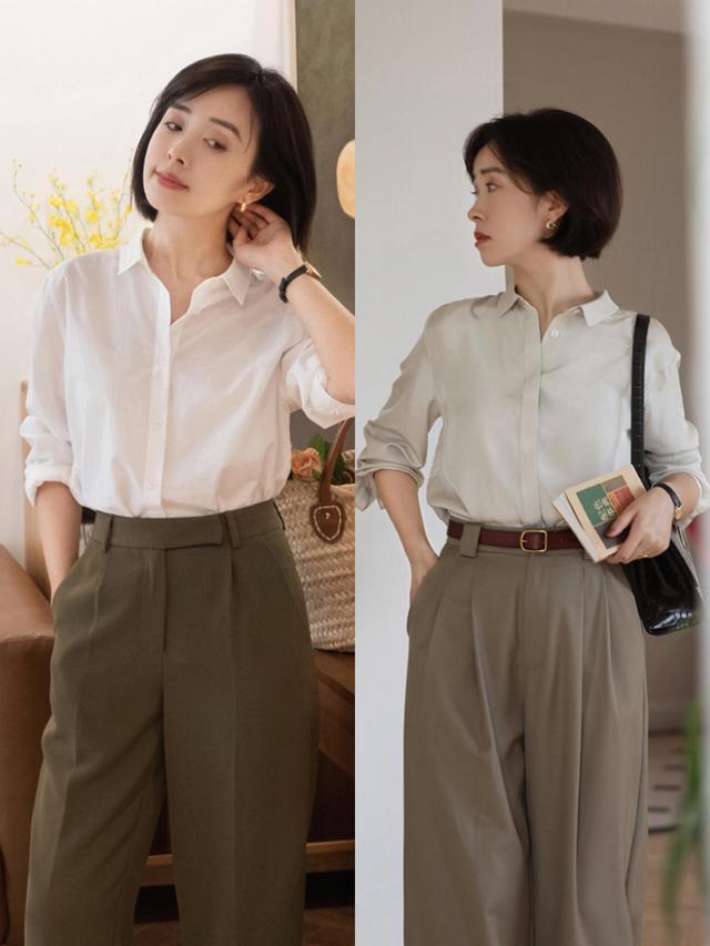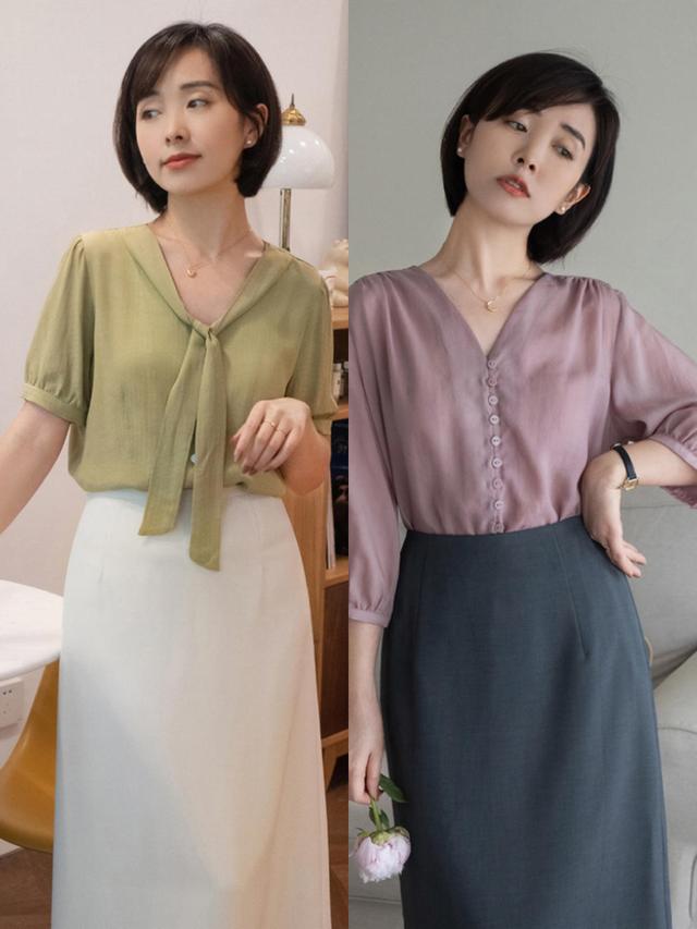 像這些襯衫和半身裙的造型就非常經典,所以上班通勤的時候也可以參考這樣的穿搭,不用擔心穿得沉悶,還可以利用這些彩色的襯衫來展現魅力,紫色,綠色襯衫也都很優雅時髦,穿在身上特別美。
