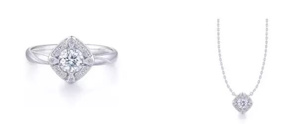 左:18K白色黃金鑲嵌鑽石戒指,高貴的方形輪廓與優雅的圓形鑽石,是動與靜、力與美的巧妙結合,更是TA對你朝朝暮暮的思念、一生一世的相守。
