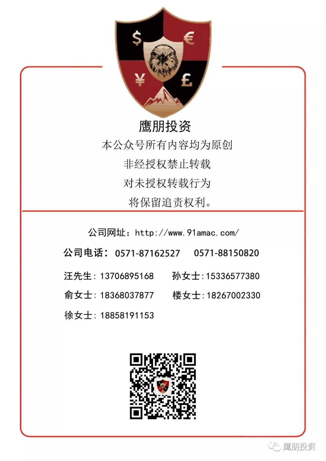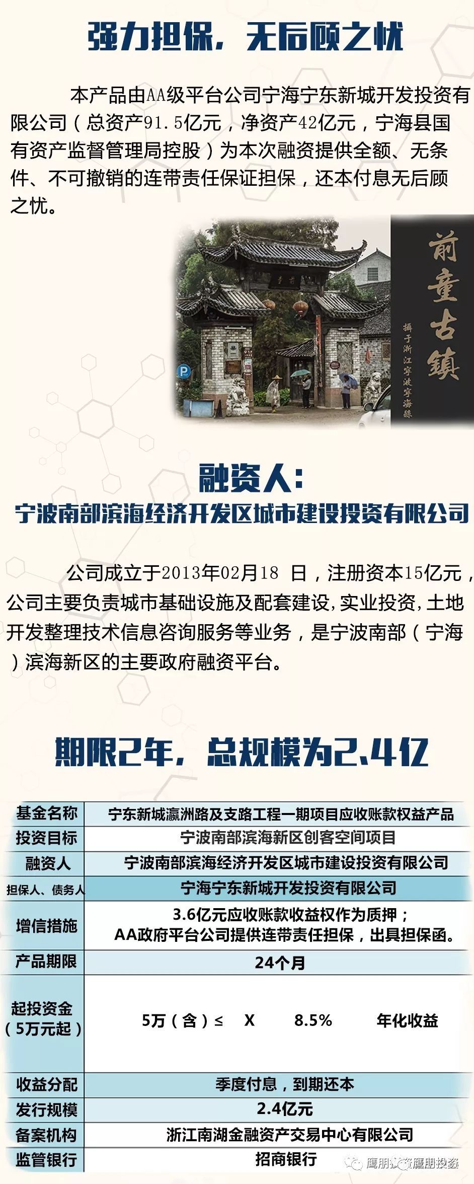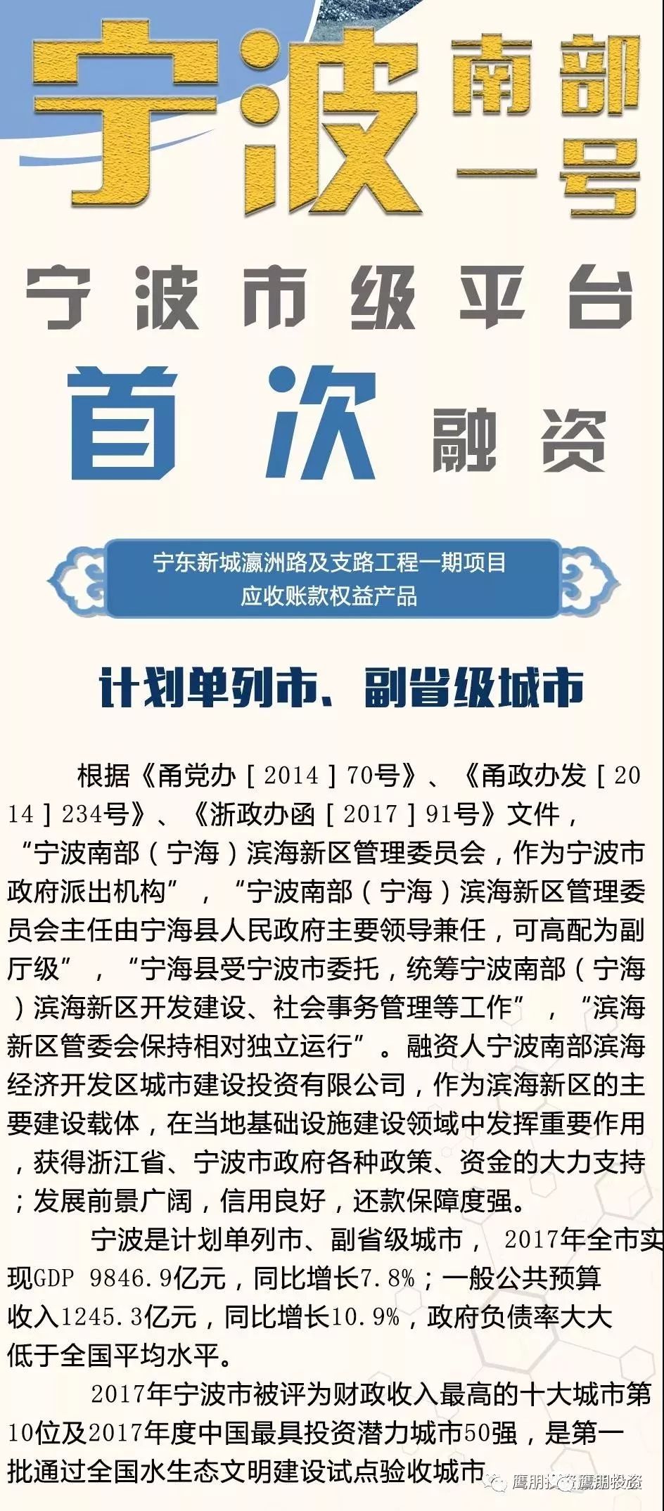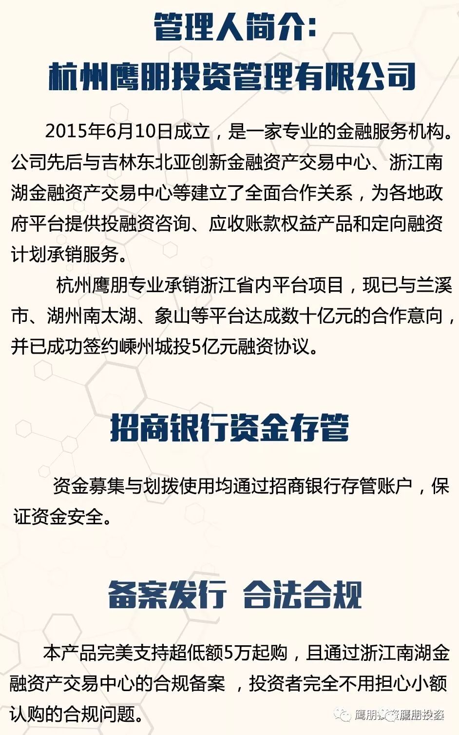 鷹朋投資主營政府平台融資、應收帳款權益產品和定向融資計劃承銷,所有資金均流向各級政府,有政府信用做支撐,資金安全有保障。