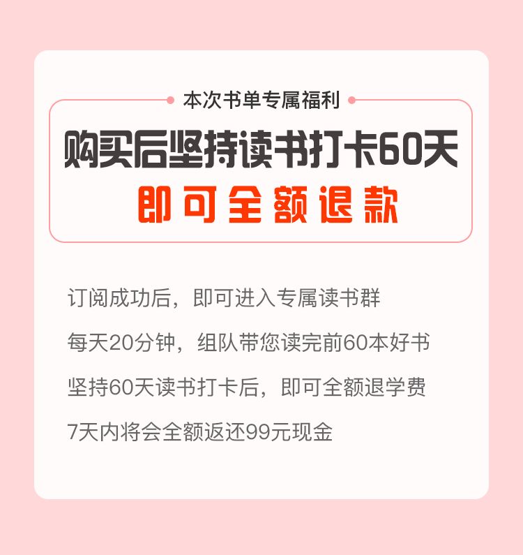 堅持60天讀書打卡後,您已養成良好的閱讀習慣,我們也會在7日內,全額返還現金作為您堅持閱讀的獎勵。