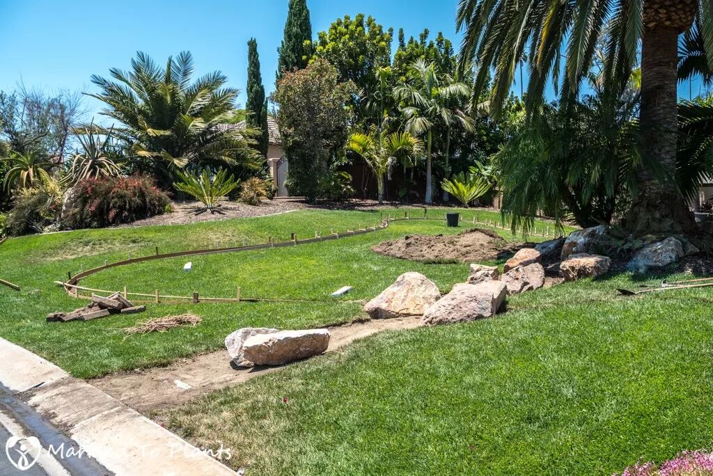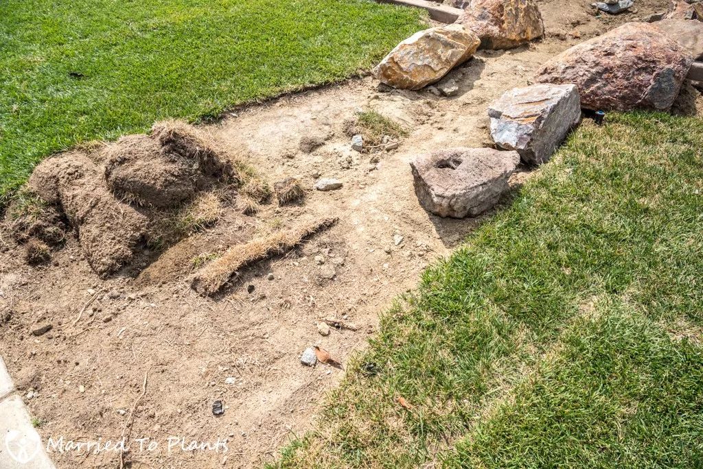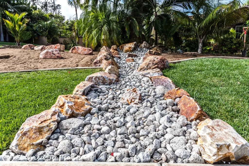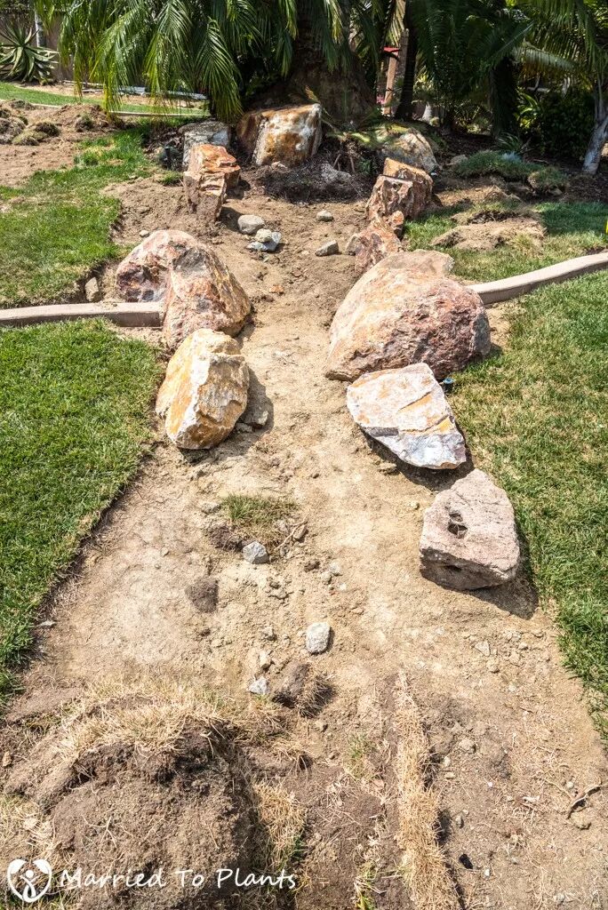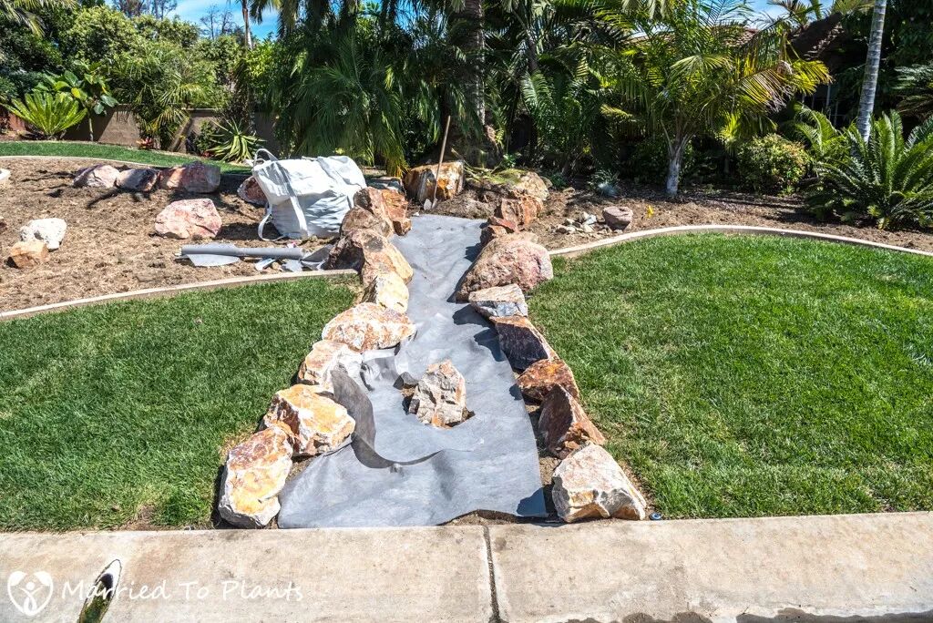 移除現有的草皮,並放置石頭,初步劃定旱溪的區域,提供大概的設計輪廓。