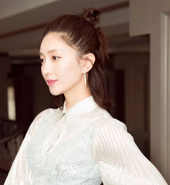 倪妮配合著小V領的上衣盤一個高高的丸子頭,使她的脖子看上去非常修長。