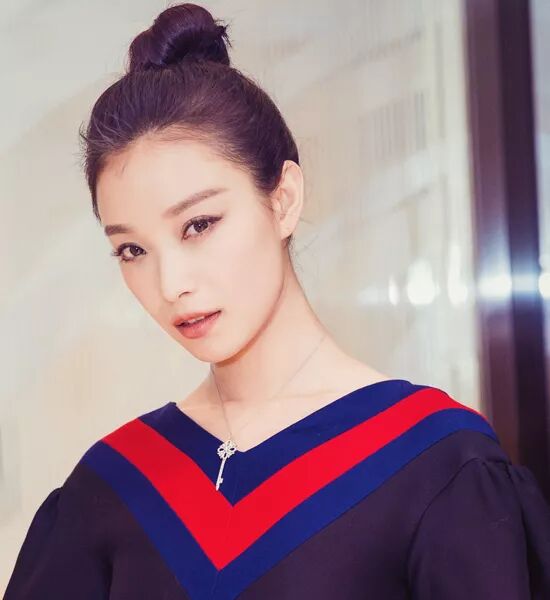 倪妮配合著小V領的上衣盤一個高高的丸子頭,使她的脖子看上去非常修長。