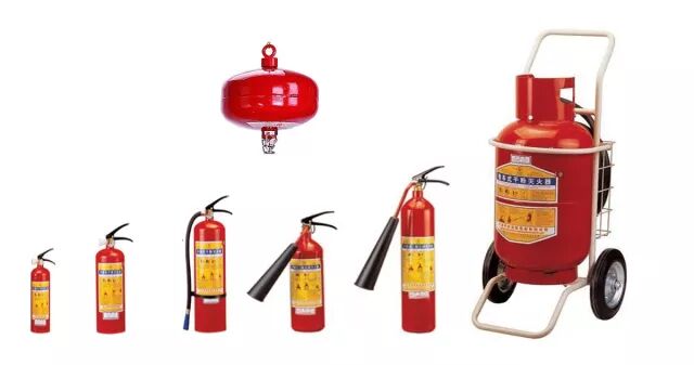 通常來說,最常見的紅色的是手提式ABC幹粉滅火器,綠色的一般是水基型滅火器,還有一些很少見的二氧化碳滅火器。
