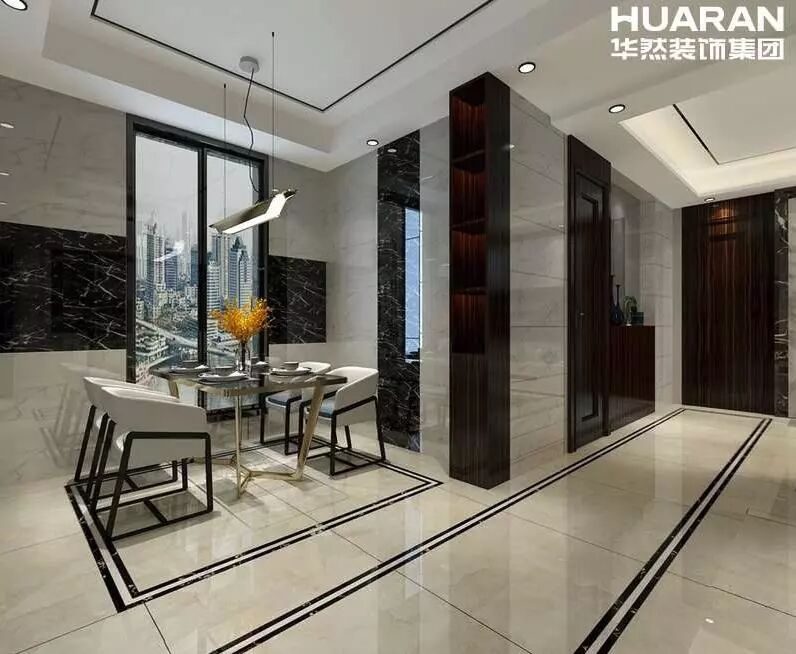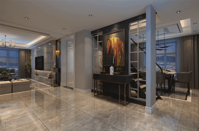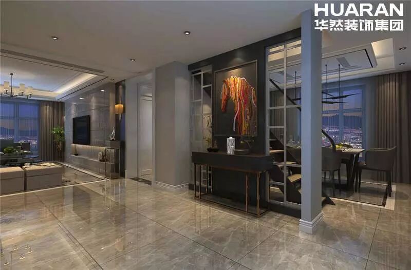 室內空間設計上,運用鋼化玻璃、不銹鋼等新型材料,獨特的裝飾手法,給人一種不受拘束和束縛的感覺。在這樣的環境下,房子不僅住得舒適,還有個性的追求。在客廳的設計中,以黃色為主色調,電視背景牆的精心設計和電視櫃是整個空間的焦點,展現現代港式風格特有的設計特色。餐廳溫馨的氣氛燈光,讓家人們盡享浪漫晚餐。