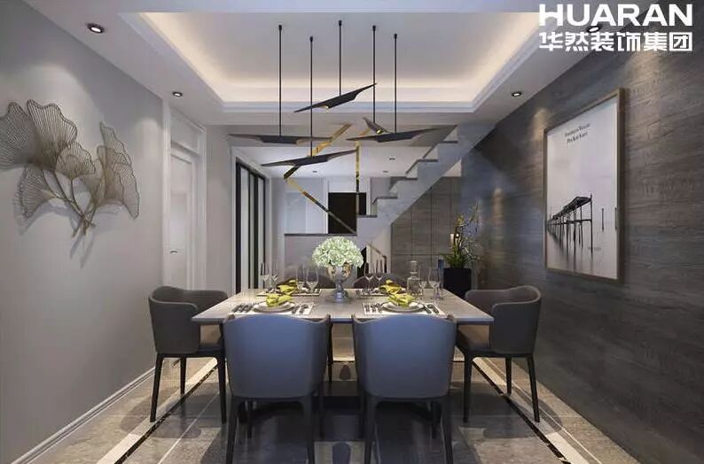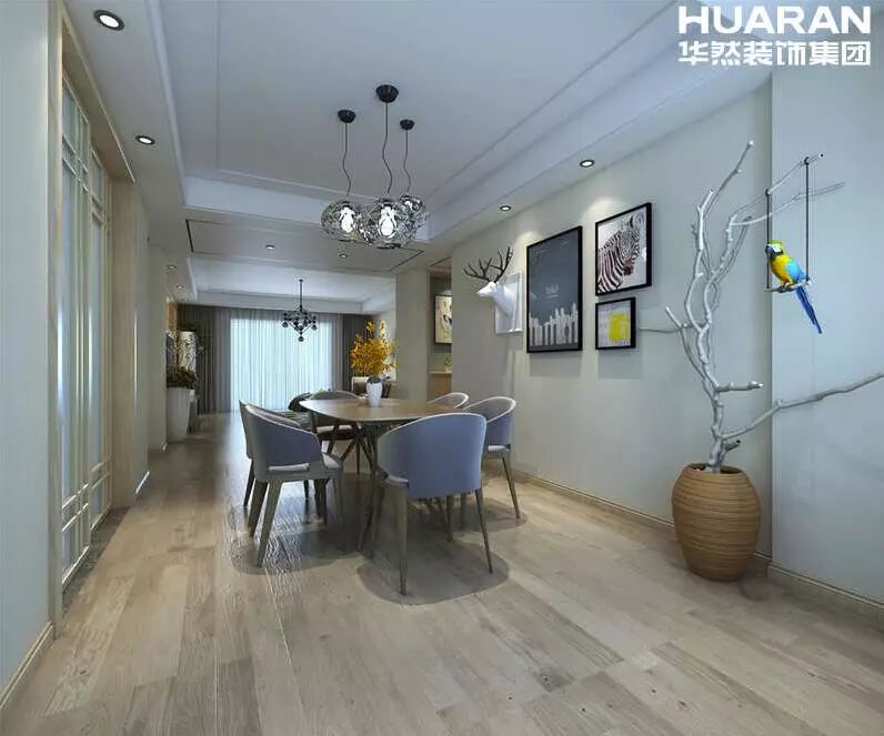 在客廳背景的設計中加入了現代的設計元素,把木飾面的溫潤與現代家具的簡約感有機融合,輔助以軟裝配飾,讓浪漫舒適的北歐簡約風格得以完美呈現。極簡的餐桌,整個空間搭配都顯得格外的精緻愜意。靠餐桌的這面牆掛著幾幅抽象的裝飾畫,顯得韻味十足。