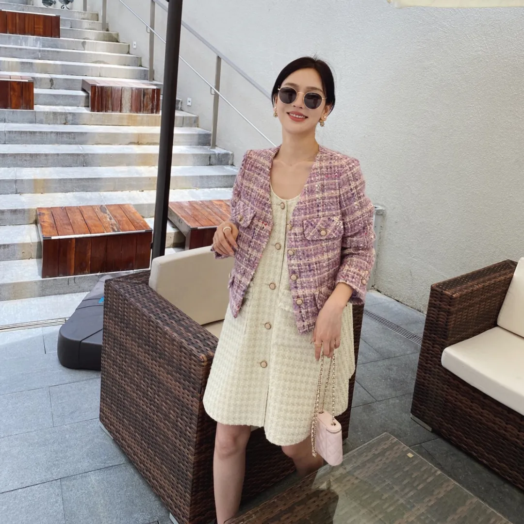 相信每個女生衣櫥裡都有一件小香風單品,讓女性氣質由內而外地散發出來,一個個矩形的帶流蘇的提花格子,非常獨特特又不失穩重,打造整體挺括修身、直角肩的視覺感,上身氣場開掛,突顯品味有腔調
