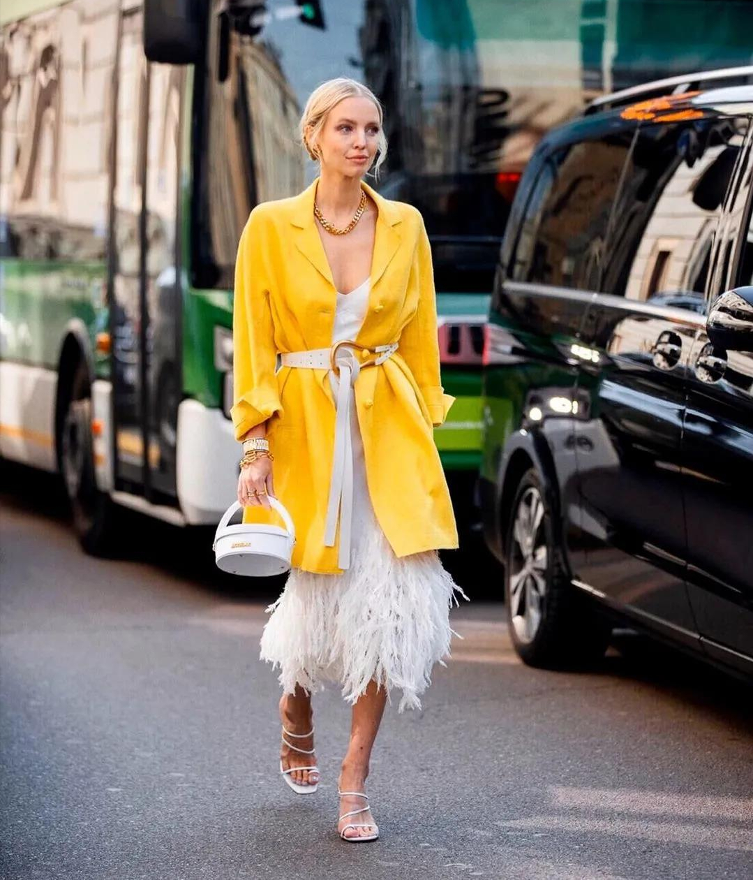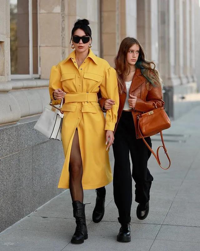 如果是大面積的風衣外套,更要注意整體的明亮系數。另外,潮酷個性的首飾,也能分擔黃色過於矚目的缺憾。