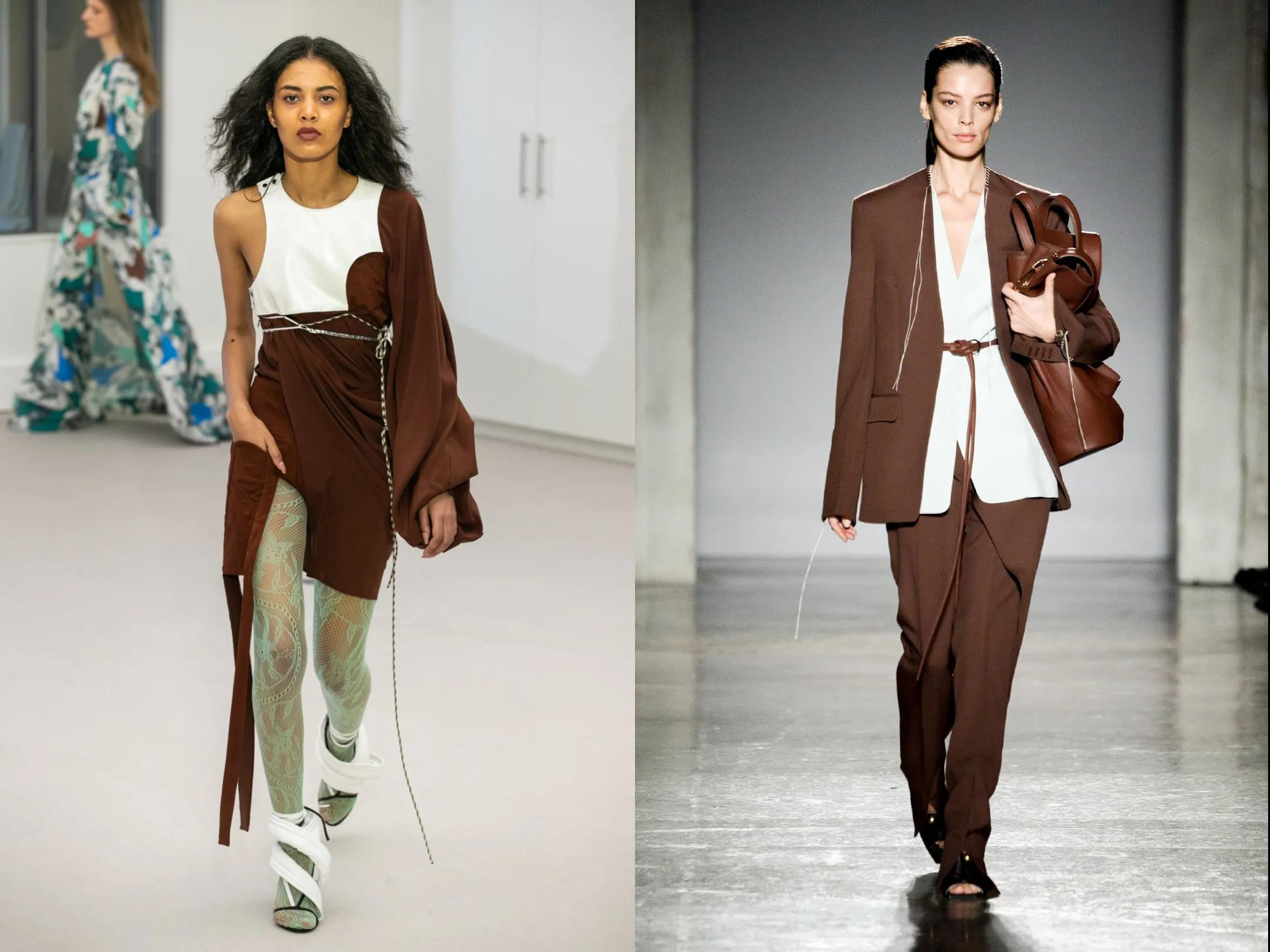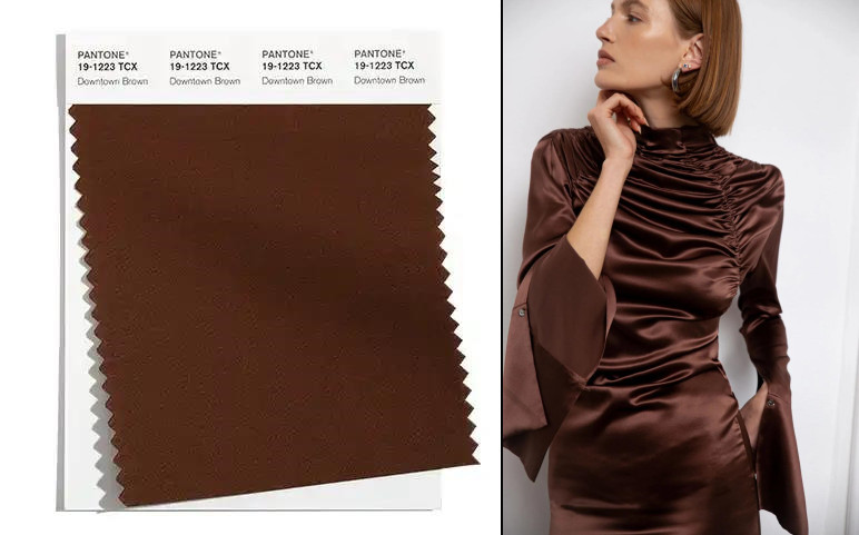 1.重面料,想化解褐色的沉穩無趣,需要從時髦面料找突破。例如光澤感、輕薄垂順度等,與眾不同的材質,更適合與褐色會晤,提升整體質感。