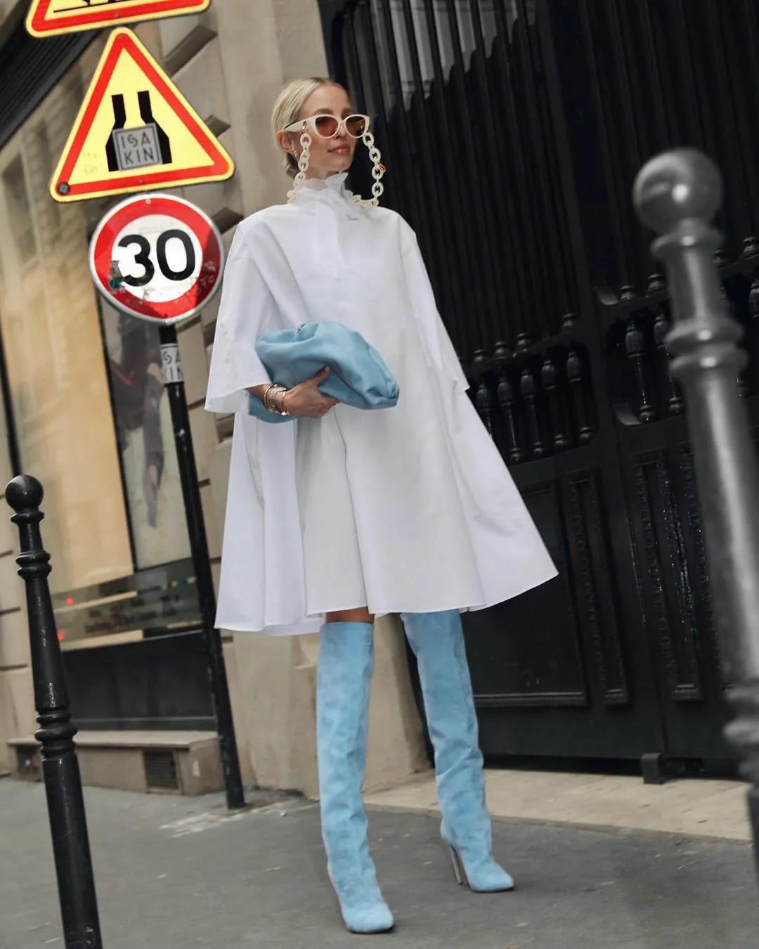 晴空藍,還有一個寄托空間,那就是鞋包等配飾。潮酷的長筒靴,讓它附著,又是關於矛盾沖突的制造話題。不稀奇,卻挑穿搭功底。