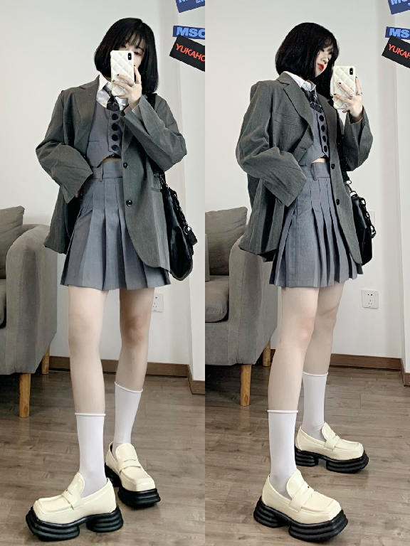 它還賊百搭,能跟一切的裙子、褲子組cp。不過外語學院的女生要穿出復古學院風的感覺,還是得搭配百褶裙。