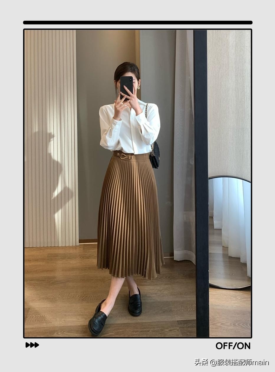 如果沒有合適的針織衫也沒關係,找一件寬鬆版型的白襯衫,搭一條百褶裙,出現在婚禮顯出也沒有什麼違和感。