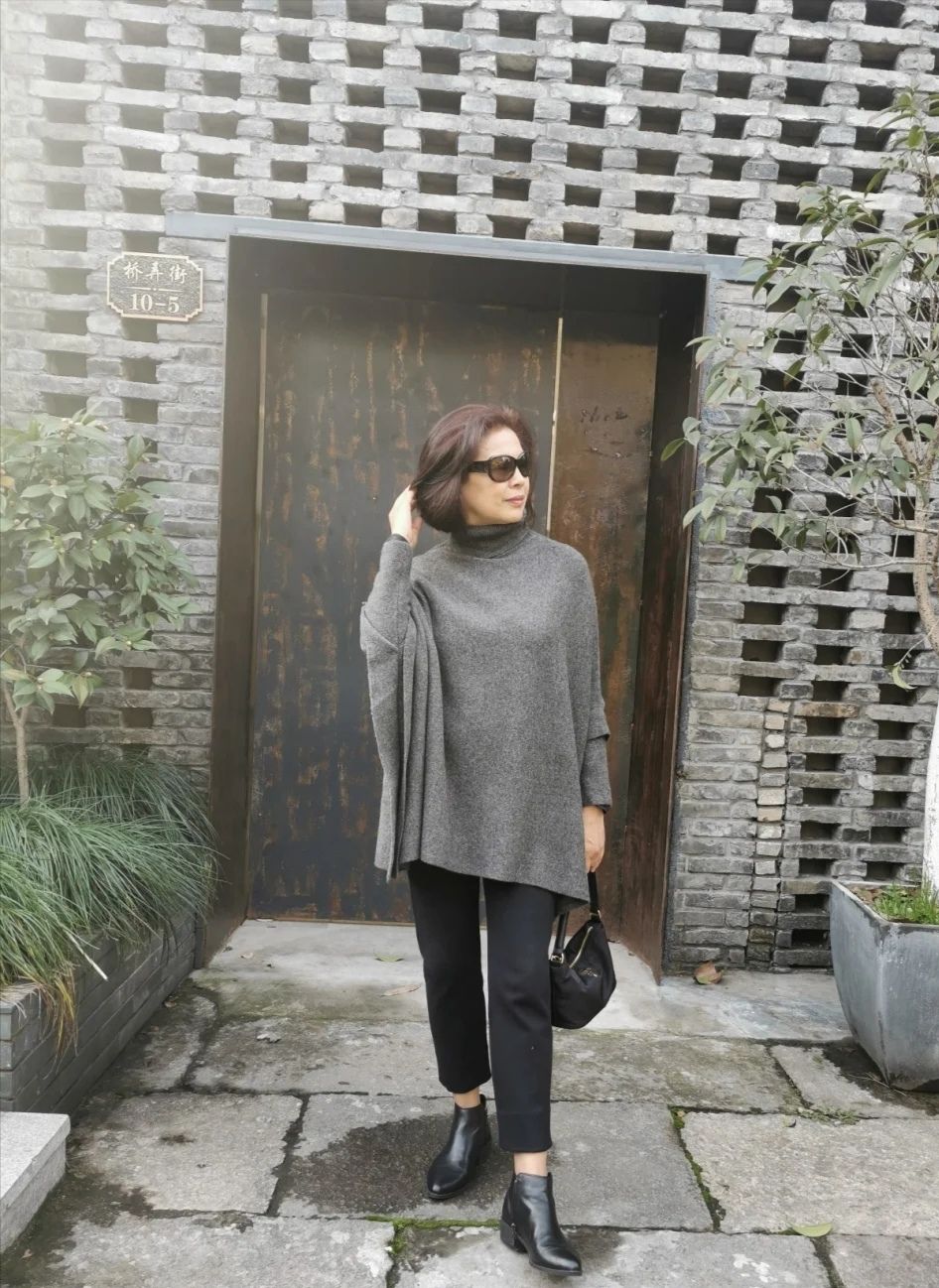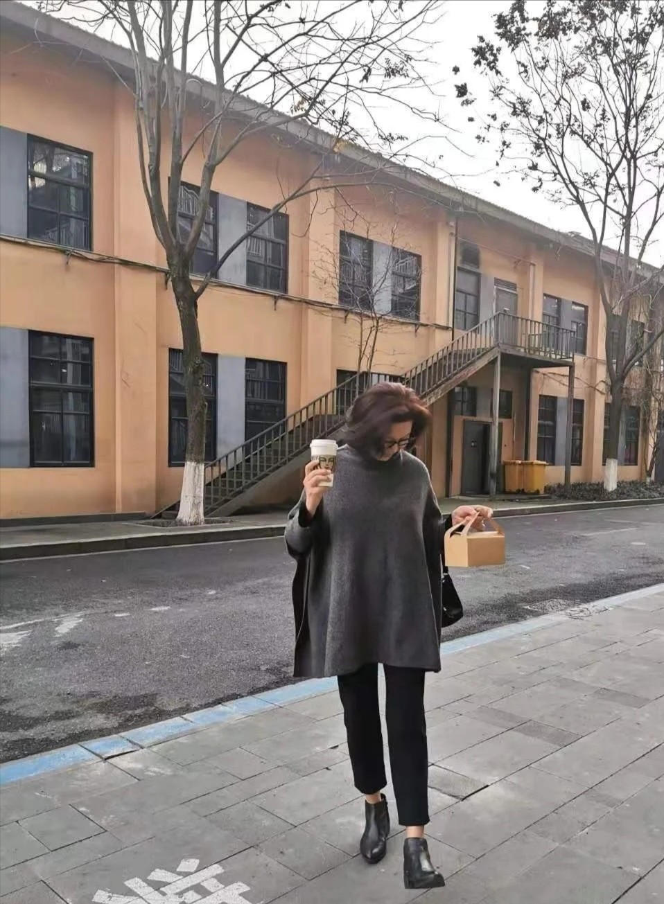 這位六十歲的女士,採用的就是很簡單基礎的黑色煙管褲和黑色短靴的配合。短靴的營造對腿部的壓力不多,對腿型也沒限制,而煙管褲裁剪流暢,設計百搭,怎麼穿都很合適,都很和諧。