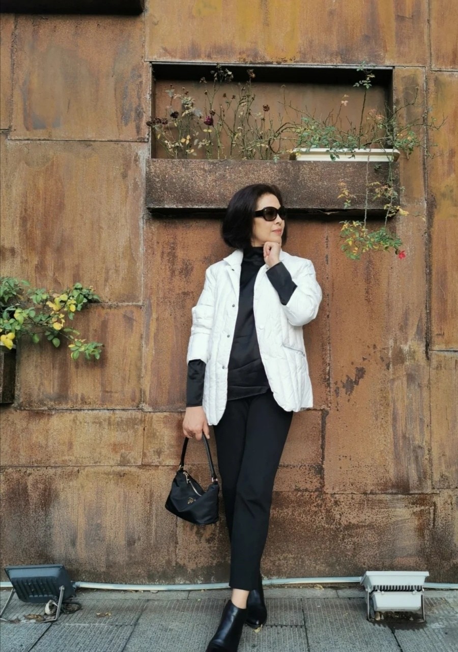 這位中年女士採用的是米白色的煙管褲,褲裝的形成很是利落,不會營造任何的厚重感,而且因為顏色的關係,整體畫風的構成也柔和,配合短靴時,自然的包裹腳踝,也不會讓人覺得這款穿搭的暖意不夠。