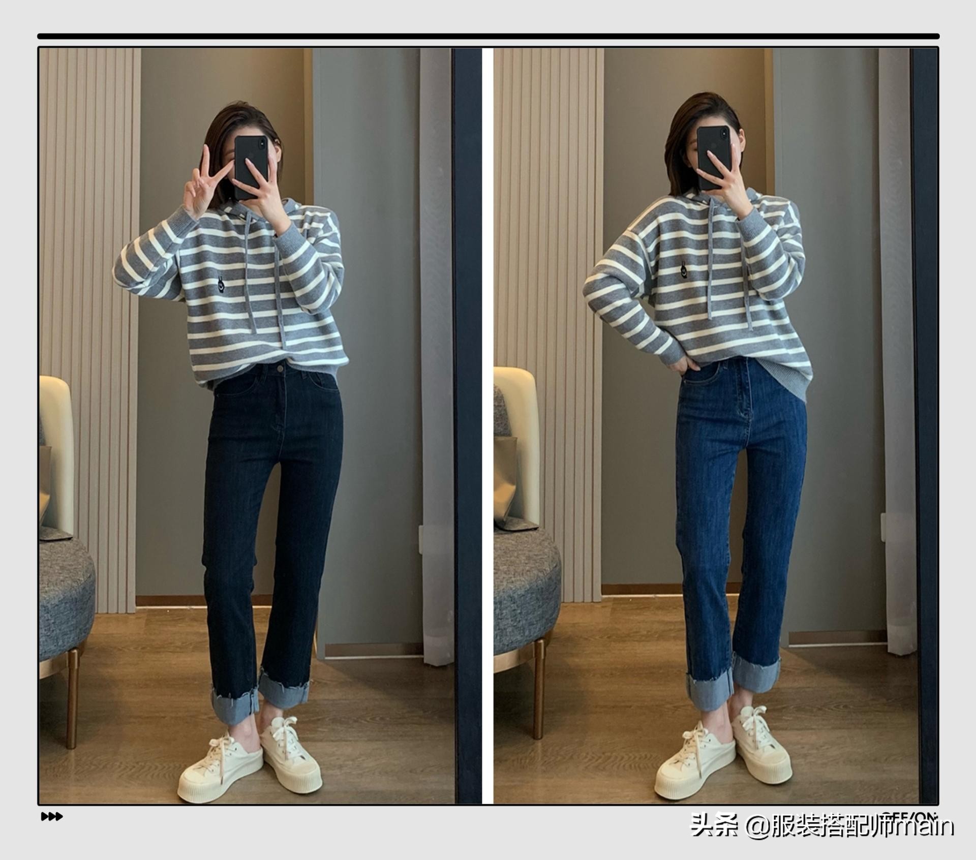 如果感覺太過慵懶,下裝可以選一條直筒牛仔褲,對腿型修飾的作用還是很有效的。卷起褲腳露出腳踝,還挺顯腿長的。