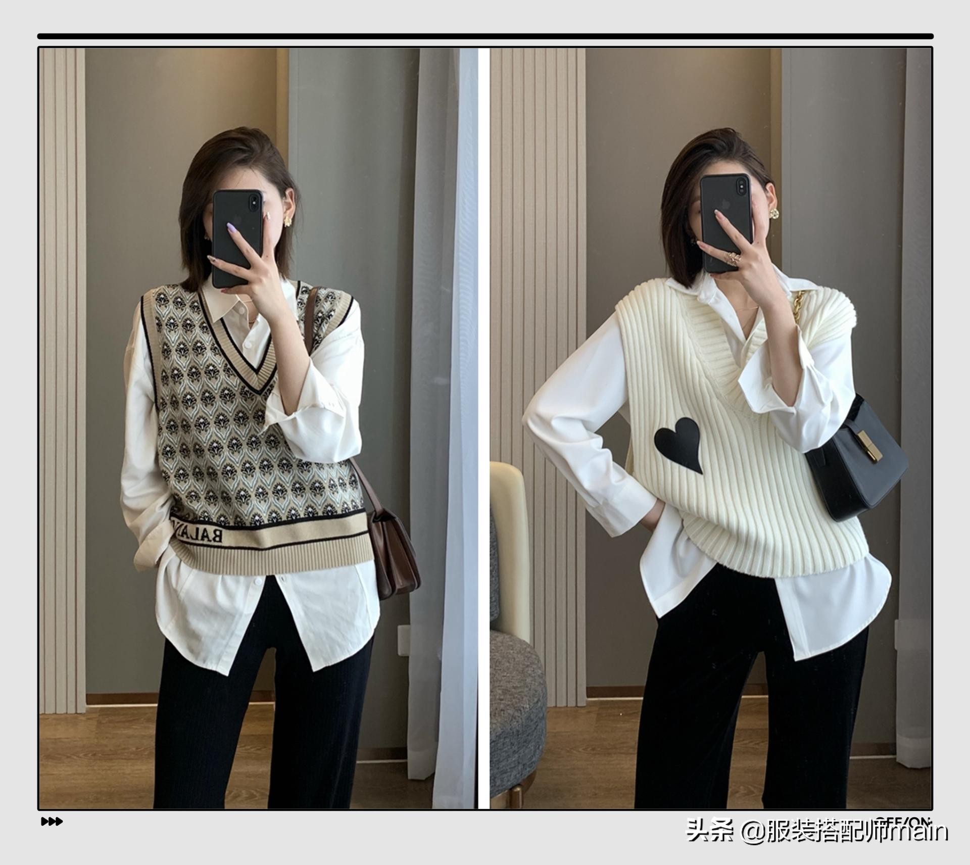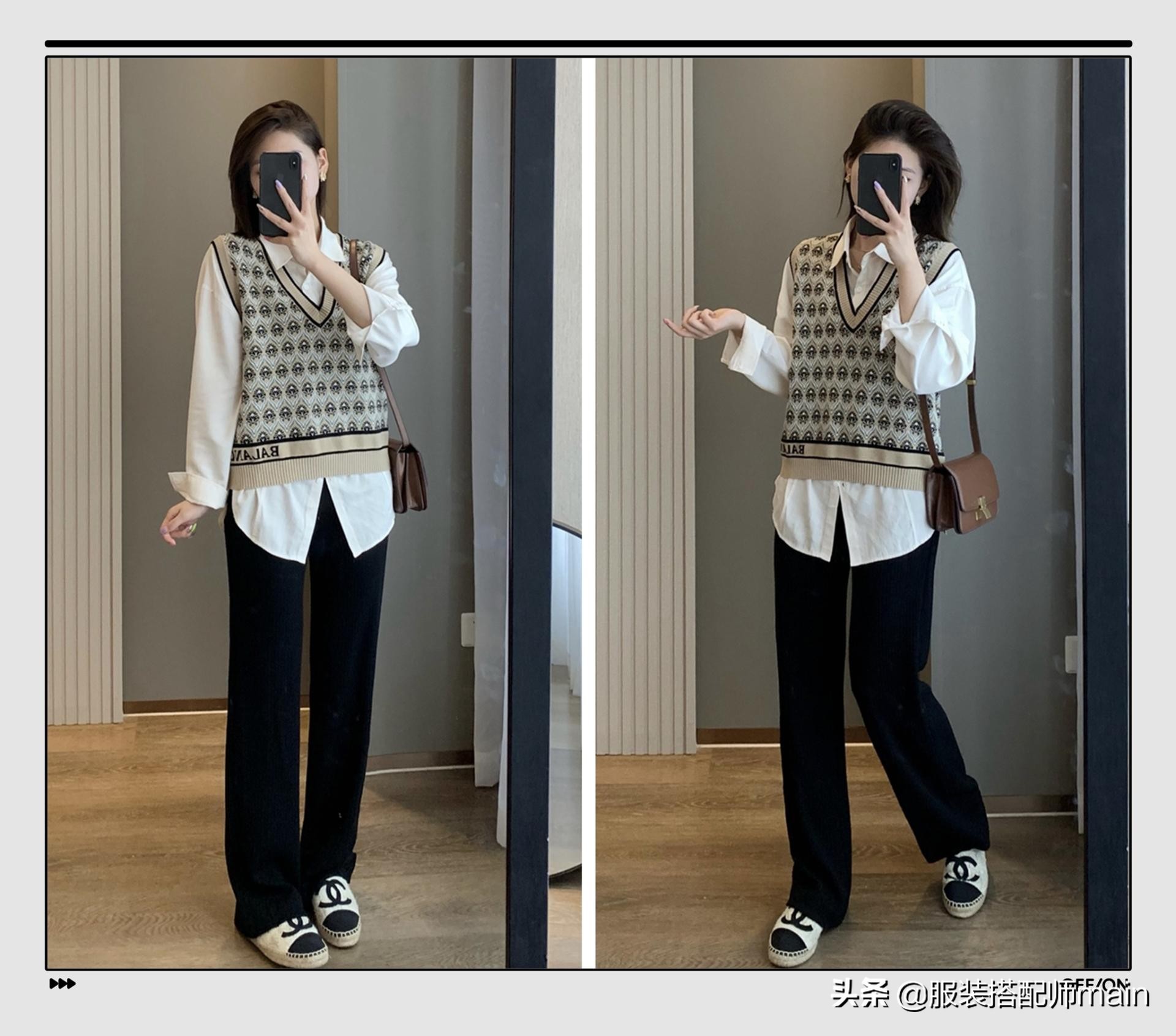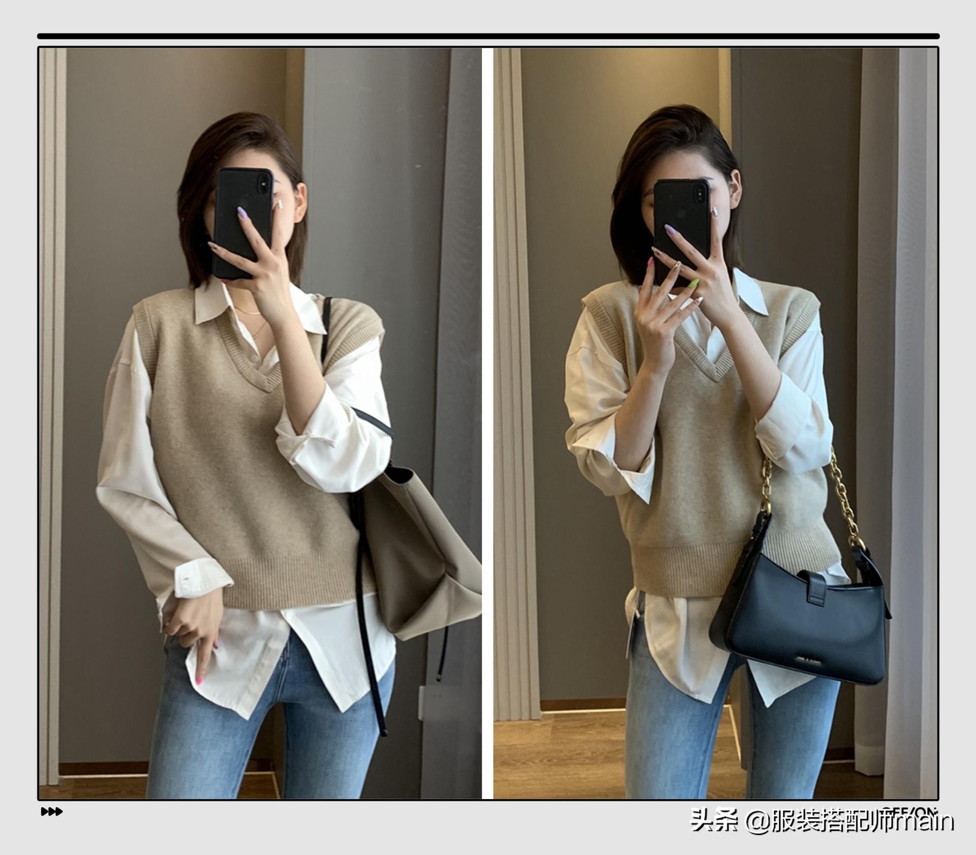 針織背心+襯衫的穿法,很容易就穿出文藝氣質,或者是減齡的學院風。而且舒適又保暖。