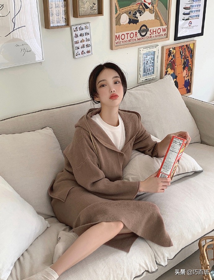 如果選擇內搭,你可以選擇疊搭加絨款牛仔外套或者皮毛一體的保暖外套,最外面的衣身長度只要超過針織開衫的衣身長度就是完美無瑕的!