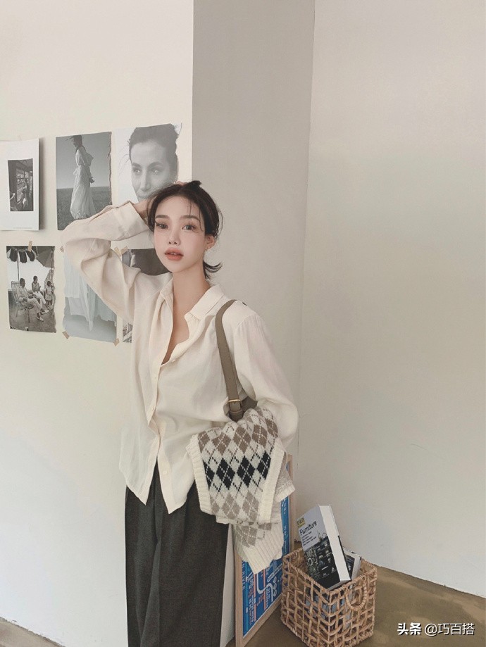 如果你感覺針織外套單穿或者疊穿容易顯老氣,也可以選擇博主身上這種菱形格紋款式的針織馬甲。