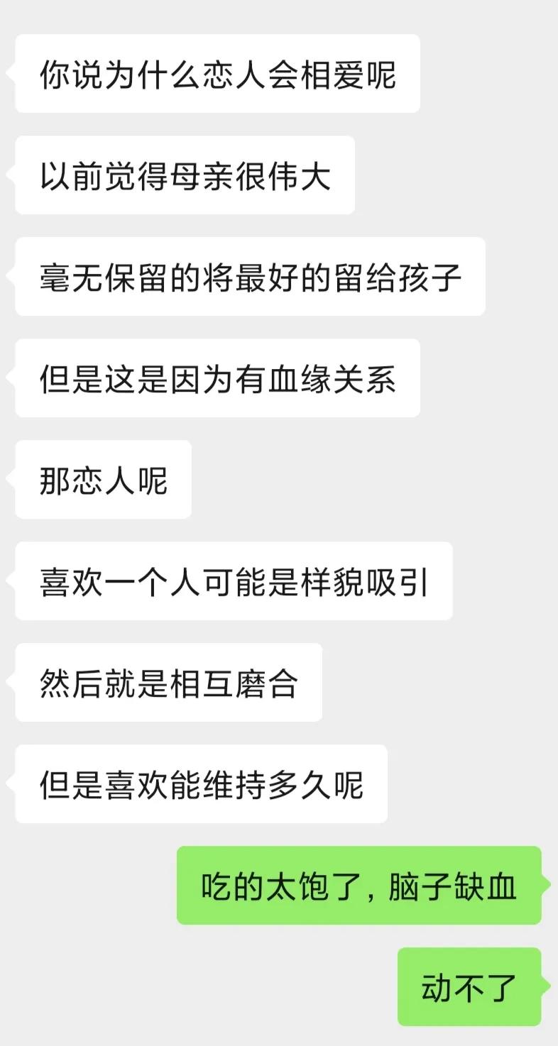 戀人相愛是被樣貌吸引,是受本能驅使,是建立在群居動物的特性上,是想要有人陪有人疼,是為了滿足肉體的欲望,這些都是戀愛的淺層含義。我當時隻聊了戀愛的淺層含義,我覺得可能沒有太大幫助。