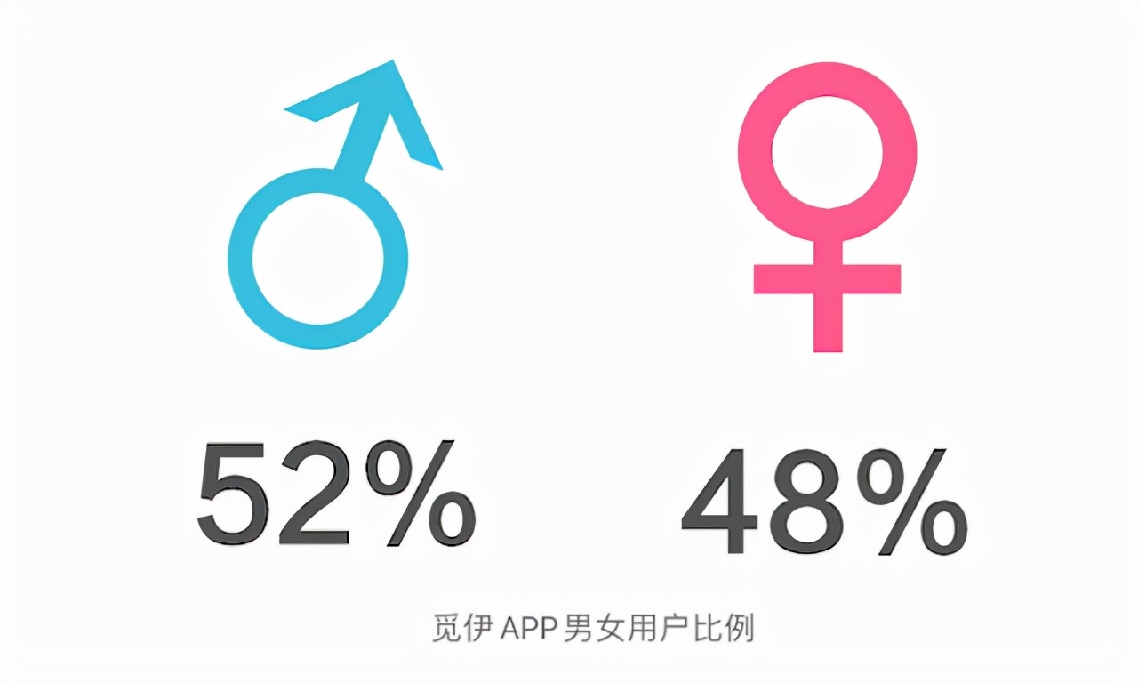 從覓伊的性別分布來看,女性占比近48%,男性占比約52%。從比例我們可以看出,男性比女性的社交需求更為強烈,其中也有一些原因可循。