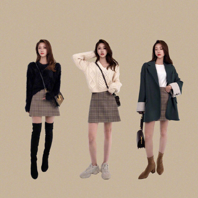 +米色毛衣:菱格紋圖案的出現,讓米色毛衣休閒意味十足,搭配同色格紋短裙,整體散發著柔和親切力,與黑色的酷冷截然不同。