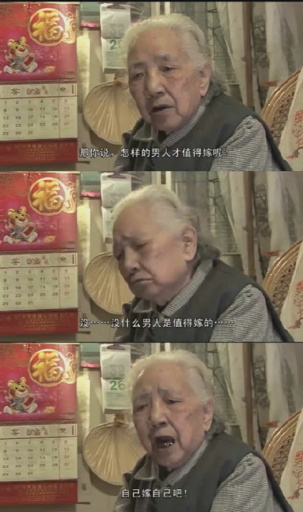 第三位老人的回答很酷:管你什麼事!誰看不起我,我就不理睬他,你有你的生活,我有我的生活。那你說,怎樣的男人才值得嫁呢?沒有什麼男人是值得我們嫁的,自己嫁自己吧。