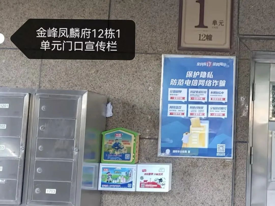▲受害人所在小區單元門防詐騙宣傳張貼處