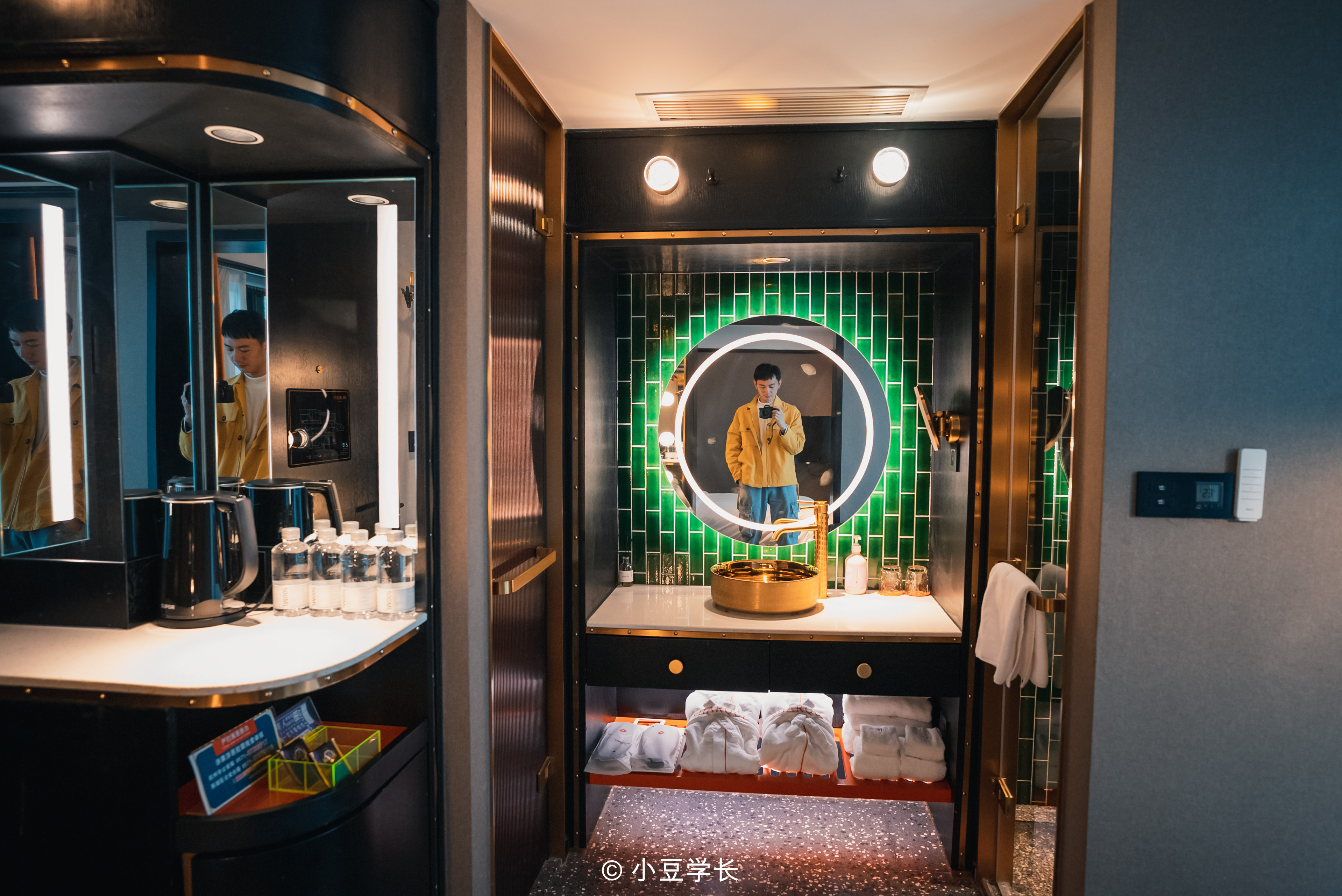 門口有一處全身鏡,不由自主地我就拿起來相機,鏡子是女生看自己穿搭的必備品,入住的房間裡有專門的化妝區域和鏡子,吸引來的女生客戶就一定很多了。內處呈現摩洛哥風情,led大屏鯊魚VCR,度假蔚藍海,熱情洋溢棕櫚樹,簡約工業風格化與無國界自然景觀相融,妥妥的異域風情!