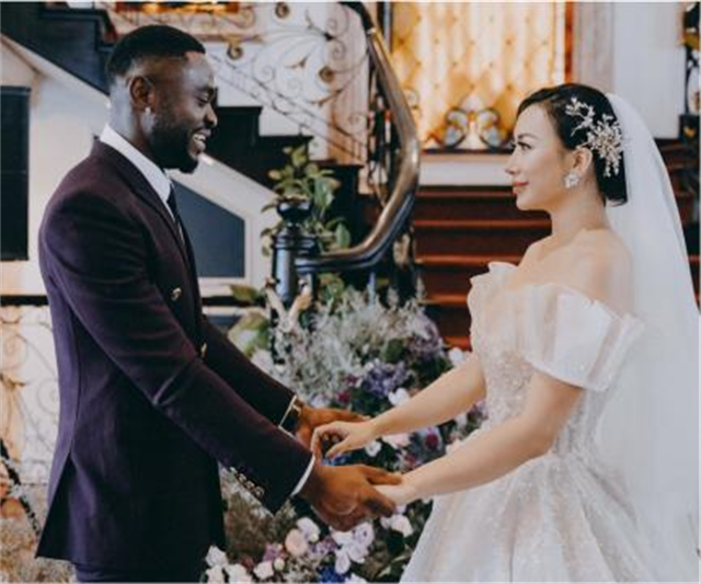 婚禮期間,秋芳穿著10多公斤重的婚紗裙,但在下樓梯的時候險些摔倒。就在她驚慌失措,一腳踩在裙子上時,丈夫傑西及時伸出了援手。