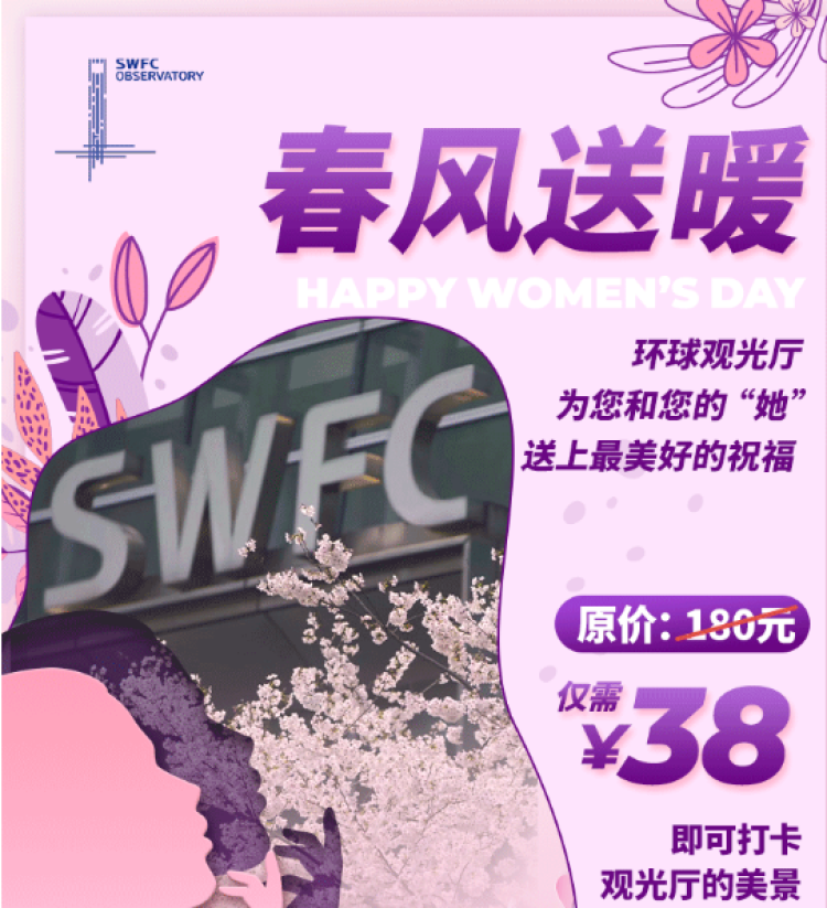 春風送暖,環球觀光廳3月5日-3月8日推出女神特享,觀光廳打卡成人聯票僅需38元;3月5日至3月28日還有女神節特惠商品套餐169元,可得環球原創特制環保袋+真絲眼罩+觀光廳100層成人門票一張(不限性別)。