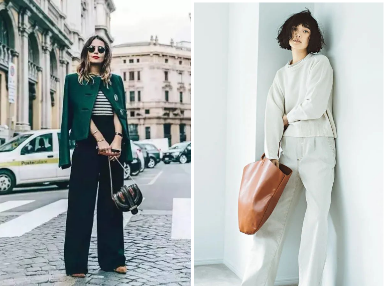 在保留闊腿褲慵懶風格的前提下,想讓闊腿褲幫助我們顯高顯瘦,那麼就要在選款時注意版型中的兩個元素了。