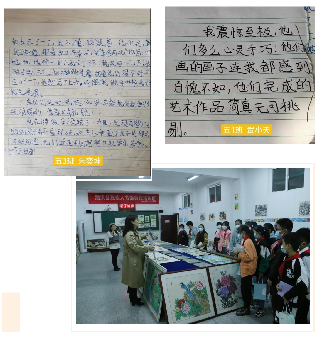 特校的張芳副書記和教科室鐘麗麗主任熱情地接待了我們。孩子們首先對校園裡的紅綠燈產生了好奇,張芳書記說:「這是因為我們的學生接觸社會少,在校園裡對社會的必要設施進行了模擬,讓孩子們感受外面的世界。教學樓裡的‘場景街’也是為了達到同樣的目的。」接著,張書記帶領孩子們感受「手語國歌」、觀賞「成功石」、體悟「百愛牆」。懷著好奇的心理,孩子們參觀了康復訓練室、感統訓練室、資源教室等功能室。在一聲聲的驚嘆中,孩子們欣賞著特校學生的書畫作品、剪紙、刺繡、手工等。
