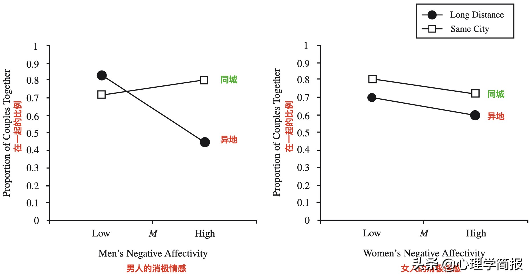 Jessica Cameron和Michael Ross發現,男人和女生在同城和異地中消極情感波動是不一樣的[3]。