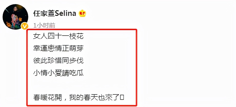 好友發聲後,任家萱也火速官宣了自己戀愛的消息,調侃「女生四十一枝花」,並表示很珍惜當下和男友的感情。「春暖花開,我的春天也來了。」