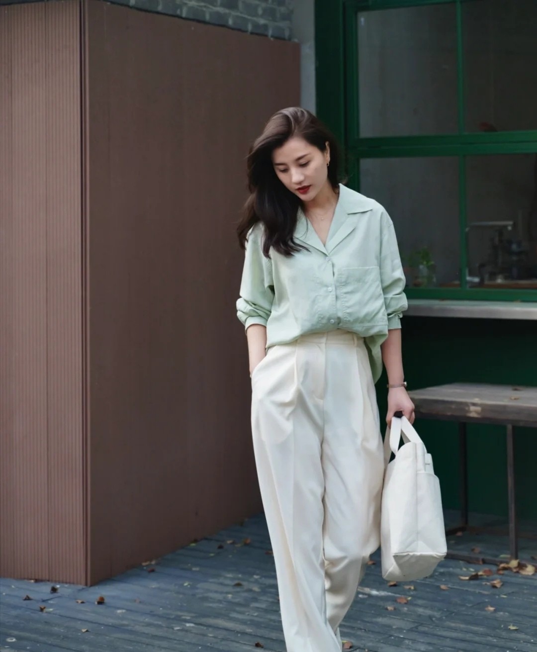 例如這條白色闊腿長褲,不管老少,穿上它都能呈現出相似的灑脫氣氛和隨性感。搭配一款薄荷綠色的襯衫,讓配色有個性,但畫面完全不混亂。