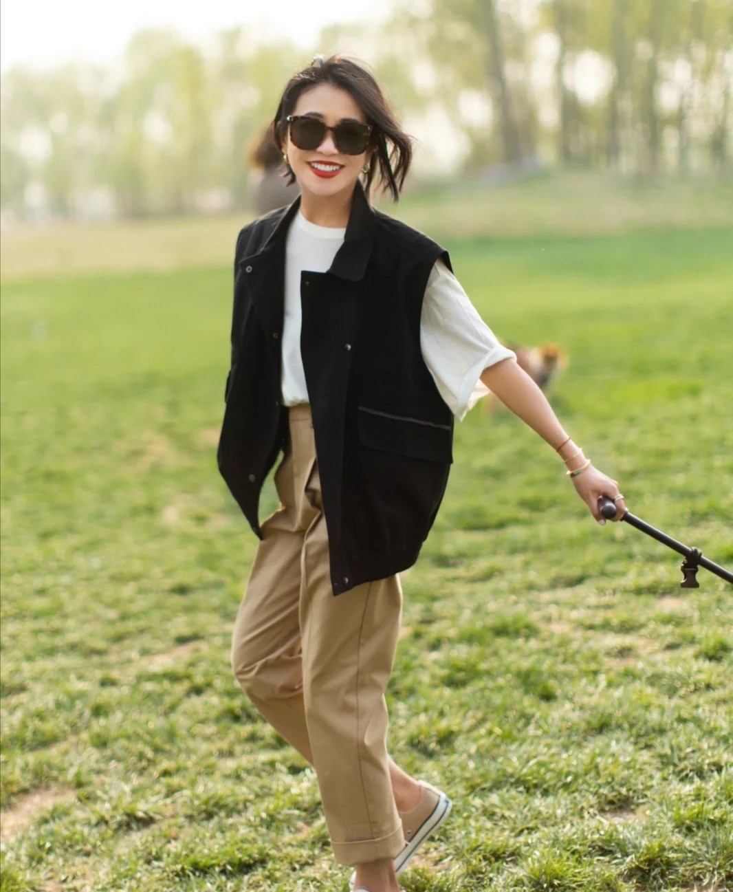 像這件白色的T恤,在外面疊加馬甲,就能用色彩碰撞層次感,色彩的反差明顯,因此它可以形成更加鮮明的配色。結合一條卡其色褲裝,豐富穿搭,豐富色系,讓畫面不會單調。這樣的造型可以維持明顯的舒適感,也可以打造出顯而易見的休閒感。